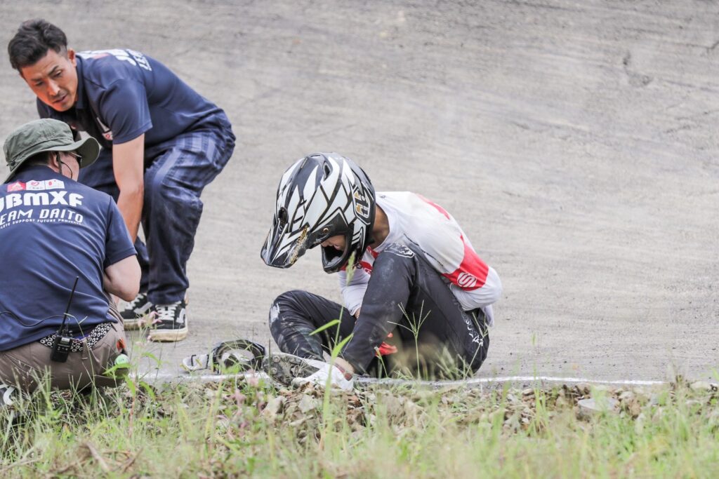 1 本⽬は5コースからのスタート。安定したスタートを決めて内側に寄せていったが、⾃分よりも内側からスタートしていた選⼿も好スタートを決めており、そのまま第1コーナーへ進⼊し、接触。転倒してしまった。幸い⼤きな怪我はなかったものの、⾃転⾞の前輪が⼤破してしまい、1本⽬は棄権となった。